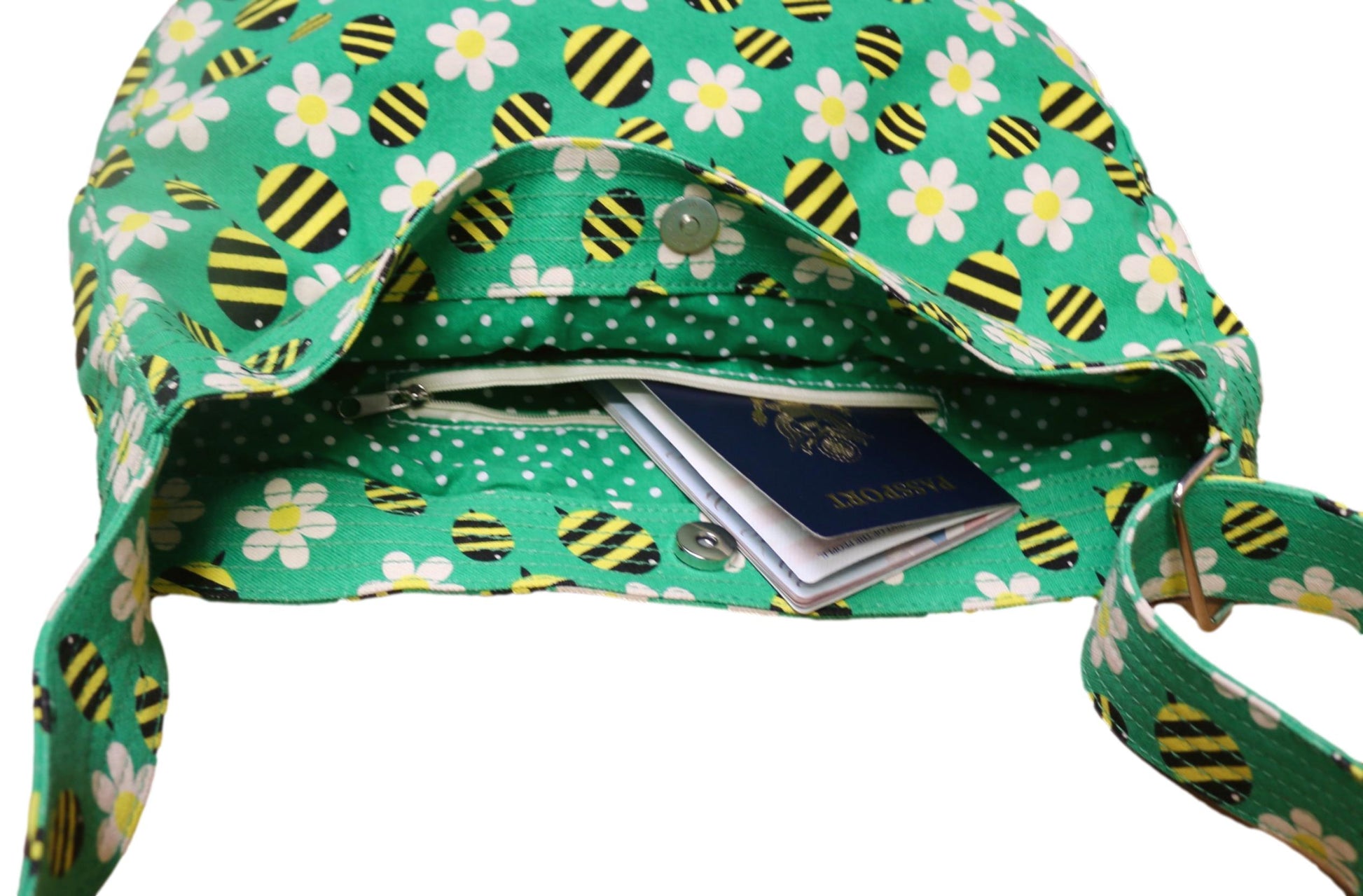 - Cute polka dot lining. Magnetic snap closure.