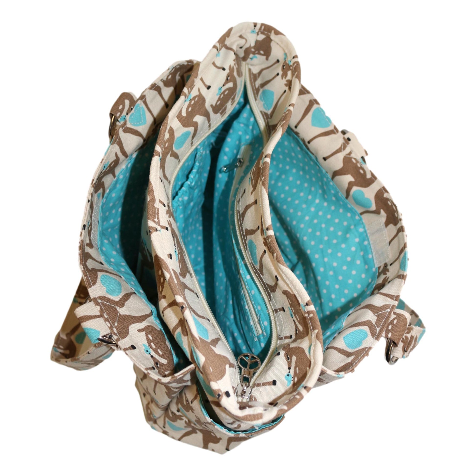 - Interior features 1 main compartment (zippered closure with signature peace sign zipper-pull), 2 side velcro compartments